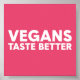 This graphic features bold, pink typography stating “VEGANS TASTE BETTER” prominently. The design employs a modern, eye-catching font that emphasizes the positive message about veganism. The bright colour scheme and strong text create an engaging visual, appealing to those who appreciate or promote plant-based lifestyles. This piece can serve as a slogan for a vegan campaign, restaurant, or awareness initiative