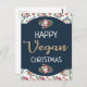 These retro Christmas greetings postcard feature the words "Happy Vegan Christmas" in a white modern and a golden calligraphy font, with an elegant blue background and floral wintry borders.