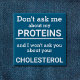 This minimalist fun button, featuring the wording "Don't ask me about my proteins and I won't ask you about your cholesterol" in black lettering on a blue background, is the perfect gift for every vegan.