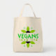 Attractive grocery tote with vegan message: Vegans Love Life in shades of green.