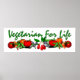 Yummy row of fresh garden vegetables form a line with the words "Vegetarian for Life" on top of it to illustrate the double meaning of never eating meat and living longer because you don't eat meat.