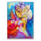 Colourful, whimsical and artistic carnival musicians in the moon light ,watercolor painting with bright colours in red,pink fuchsia blue,yellow colours .Characters inspired from Commedia dell' Arte and Carnival of Venice and Venetian feather masks.