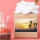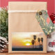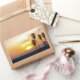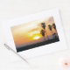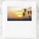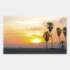 This photo shows a beautiful golden yellow, orange, red, and purple sunset over the Pacific Ocean in Venice Beach California. The scene has silhouettes of people walking along the famous boardwalk near the towering palm trees lining the shoreline of sand and sea.