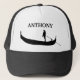 Create a personalised gift with a Venetian style. This baseball cap or truckers hat features a silhouette style illustration of a Venice, Italy gondolier and gondola in black and is ready to be personalised with a name above in matching black lettering