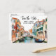 The "Save the Date" card presents a picturesque scene of Venice, Italy, beautifully rendered in watercolor on the front. Against a backdrop of serene canals and charming Venetian architecture, the essence of the city's romantic allure is captured in every brushstroke. Gondolas glide gracefully along the tranquil waters, while historic buildings with their ornate facades stand tall under the warm Mediterranean sun. In elegant script font, the words "Save the Date" adorn the top of the card, their graceful curves mirroring the flowing canals of Venice. Below, the names of the bride and groom are delicately intertwined, written with a sense of tenderness and love. Beneath their names, the wedding date is displayed with subtle sophistication, marking the momentous occasion that awaits.