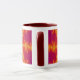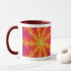 This brightly coloured coffee mug features a fractal image that is reminiscent of a thunderstorm on Venus. It has a bright orange background with bright yellow lines coming out from the centre that look like burning bolts of lightning. In the centre of each lightning bolt there is a blue line that reminded me of a vein resulting in the title Venous Thunderstorm. The design is shown here on a red and white ringer style mug but is also available on other colours and styles of mug.