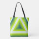 This image is a geometric abstract design featuring nested, concentric triangles. The triangles are arranged in a way that creates an illusion of depth and perspective, drawing the viewer's eye towards the centre. The colour palette consists of various shades of green—from deep teal to bright lime and pale green—which blend seamlessly to form a visually striking gradient. The symmetry and repetition give it a dynamic, modern feel, making it suitable as digital art, a background, or even print design.