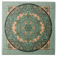 This pretty tile features classical style mandala; a richly detailed kaleidoscope of branches and leaves in varying hues of green and turquoise, set over a terracotta background. Ornamented by grapes at the corners and anchored by the sun at the centre.
