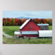Dairy cattle graze in the corral outside of a red barn in the Northeast Kingdom of Vermont. Brilliant Autumn foliage surrounds the farm, one of many charming farmsteads in New England.
