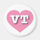 This magnet features a cool, pink heart containing the bold, white, upper case letters VT, the official abbreviation of Vermont, the green mountain state.
