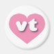This magnet features a calm, cool pink heart containing the bold, white, rounded lower case letters vt, a playful abbreviation for the state of Vermont, the green mountain state.