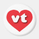This magnet features a vibrant red heart containing the bold, white, rounded lower case letters vt, a playful abbreviation for Vermont, the green mountain state.