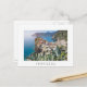 Postcard of the colourful houses of the small fishing town Vernazza, one of the Cinque Terre villages, built on a rock at the Mediterranean coast of Liguria, near La Spezia in Italy with a white border and the text 'Vernazza'.