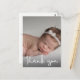 Personalised with your baby girl's photo on the front and special message on the back. This design uses an elegant hand-drawn script font for a touch of sophistication. Express your excitement in announcing the birth of your child and send your gratitude at the same time. The words "Thank you" overlay is in a modern white font.