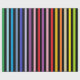Abstract digital art of lighter coloured broader spectrum rainbow stripes including pink, red, gold, orange, ecru, yellow, lime green, green, pastel blue, turquoise, blue grey, indigo, lavender, and purple outlined by the thinner solid colour, against a black background.
