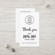 A vertical minimalist custom business logo black and white QR code discount card for a professional business to use as a promotional tool to develop customer loyalty. Replace the image with a square photo of your logo. You can change the font, font colour, font size, letter spacing, background colour, colour of the Thank you graphic and reposition the text using the Design Tool. You can also change the social media icons so they are relevant to your business. The simple modern elegant design is yours to customise as you wish.
