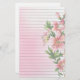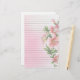 Pretty vertical group of pink flowers and greenery against a soft pink watercolor background. Lines for easy writing