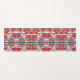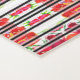 Vertical patterned fabric showcasing red flowers, green leaves, and black vertical stripes on a white background. The design is vibrant and symmetrical.