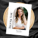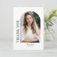 This stylish modern photo graduation thank you card features an arch vertical photo with the text "thank you" in elegant typography with customisable script name and additional text on the front to add "Class of 2025" or your choice of text. White background with black text. The back is blank for your personal handwritten message. Click the edit button to personalise this design.