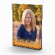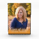 This graduation photo block features a vertical photo frame that fills the entire block. A orange gradient, across the bottom, is accented with white hand written style text that reads: Class of 2018. Custom text allows you to add the name of the graduated and their school.