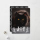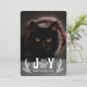 Cat paw print as the letter O in JOY with pines on both sides, sets off your feline family member's photo, family name and year on the front. A matching paw print on black patterned on the background.