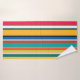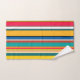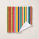 This towel set has a design of vertical stripes in shades of blue, green, brown, purple, red, yellow, orange, and pink.
