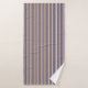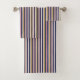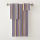 Vertical stripes towel set with a pattern of navy, red, and yellow lines hangs on a wall. Below, a matching washcloth is partially folded, revealing a white underside.
