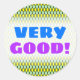 This sticker design features a pattern that involves yellow and green diamond shapes, and black lines. It also features the encouraging message "VERY GOOD!" in blue and purple coloured text. Stickers like these could perhaps be used by a teacher, an educator or a tutor to acknowledge encourage a student who has done well on a test, quiz, paper, project, or some other academic school or assignment. [~Z0000118]
