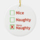 Three green check boxes with the words Nice, Naughty and Very Naughty in red text next to them, the box for Very Naughty has been checked with an "X" oops sorry Santa!