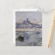 Winter image of fisherman on the river with village and tower in the background. Unique painting to send as a holiday greeting. Fine art by French artist Claude Monet.