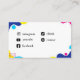 A modern and colourful business card featuring abstract shapes in blue, pink, yellow, and turquoise on a dark blue background, with space for a name/handler.