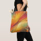 Vibrant abstract explosion of warm colours including orange, red, yellow, and blue with dynamic diagonal lines and shapes tote bag