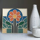 Add a touch of timeless artistic flair to your home with this stunning ceramic tile, inspired by the elegant Art Nouveau movement. The design showcases a beautifully stylised daisy, bursting with colour. Its vibrant orange-red petals radiate from a cheerful sunny yellow centre, creating a warm and inviting focal point. The flower is artfully framed by a bold royal blue arch and flanked by lush, deep green leaves. The composition rests on a geometric base of muted beige and teal, grounding the organic forms above. Each coloured section is outlined with clean, creamy-white raised lines, giving the tile a delightful tactile quality and a look reminiscent of classic stained glass. This versatile tile is perfect for creating a memorable accent in a kitchen backsplash, bathroom, or as a unique decorative piece.
