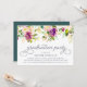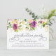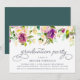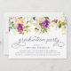 Modern watercolor floral graduation party invitation features a top border of roses and peonies in violet purple, blush pink and green with decorative typography accents and smoky blue grey lettering. Personalise with your desired graduation party invitation wording using the template fields.