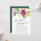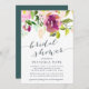 Elegant and modern floral bridal shower invitation features a bouquet of vibrant and colourful watercolor flowers in shades of violet, burgundy, cream and blush, with lush green botanical accents. Personalise with your bridal shower details in elegant midnight blue typography accented with handwritten style calligraphy. Cards reverse to solid jasper green.