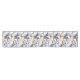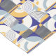 A sophisticated dining room Art Deco table runner adorned with A geometric pattern composed of various shapes and lines. It features semi-circles, rectangles, and squares, each with different summer colours combinations. The dominant colours are blue, yellow, and white. The design is symmetrical, with each half mirroring the other. The pattern is intricate, with lines forming concentric circles and intricate patterns within the shapes.
