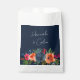 Elements: vibrant watercolor flowers and greenery with names in a fun modern handwritten style. Colours: Blue, navy, dusty blue, orange, terracotta, burnt sienna, red, crimson, green. Themes: botanical, elegant, chic, modern, romantic, casual, garden, fall, spring, summer, outdoors. Collection: Vibrant Blue Orange Red Botanical Wedding Collection. Product Type: Favour Bag
