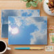 Beautiful bright blue skies with sun and pink-tinged clouds.