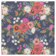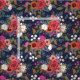 Colorful floral pattern with bouquets of white, red, orange, and pink flowers and berries against a navy blue background.