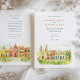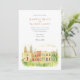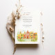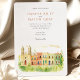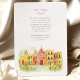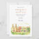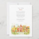 Invite your guests to a joyous celebration with this charming watercolor wedding invitation, featuring the historic and colourful streetscape of Campeche, Mexico. The artwork beautifully captures a row of colonial buildings in sunny yellows, warm oranges, rich pinks, vibrant reds, and touches of lively green, with characteristic arched doorways, contrasting colourful doors (like blues and greens), and charming balconies. A prominent church facade, possibly the Campeche Cathedral, stands out with its cream and yellow hues and twin bell towers. The scene is softened by stylised green leafy sprigs and small green bushes, adding a touch of natural beauty, all rendered in a soft, inviting watercolor style that evokes the city's sunny charm. This invitation is perfect for a destination wedding in Mexico, or for couples who adore vibrant colonial architecture and a festive atmosphere. The front elegantly presents your wedding details, while the reverse side often highlights a central building with "CAMPECHE" lettering and offers "The Finer Details" for guest information. The colour palette is a joyful blend of sunny yellows, oranges, pinks, reds, various shades of green for foliage and accents, blues for details, and warm creams.
