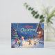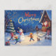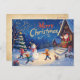 Bright and whimsical Christmas postcard featuring a snowman, Santa Claus, children, and a playful puppy in a magical winter scene. Text reads ‘Merry Christmas’