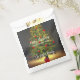 This customisable favour bag instantly captures the cosy holiday spirit with its striking, painterly design. The centerpiece is a classic Christmas tree, rendered in deep green, glowing with golden lights and adorned with vivid red ornaments. This festive scene is set against a dramatic, dark grey background, making the colours intensely vibrant. A small red wrapped gift anchors the base. The bag is fully personalised with a warm "Merry Christmas & Happy New Year" message followed by your family name. It's the perfect elegant packaging for treats and favours, merging timeless holiday cheer with a bespoke touch.