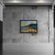A striking coastal scene with intense colors features a vivid sky and textured landscape. The composition blends bright and dark tones artfully.
