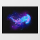 Large, blue, artistically drawn, glowing, bright jellyfish, with long tentacles on black background with purple bioluminescence. Luminous jellyfish.