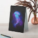 Large, blue, artistically drawn, glowing, bright jellyfish, with long tentacles on black background with purple bioluminescence. Luminous jellyfish.