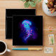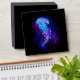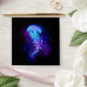 Large, blue, artistically drawn, glowing, bright jellyfish, with long tentacles on black background with purple bioluminescence. Luminous jellyfish.