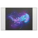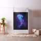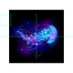 Large, blue, artistically drawn, glowing, bright jellyfish, with long tentacles on black background with purple bioluminescence. Luminous jellyfish.