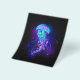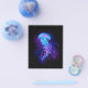 Large, blue, artistically drawn, glowing, bright jellyfish, with long tentacles on black background with purple bioluminescence. Luminous jellyfish.