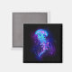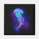Large, blue, artistically drawn, glowing, bright jellyfish, with long tentacles on black background with purple bioluminescence. Luminous jellyfish.
