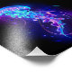 Large, blue, artistically drawn, glowing, bright jellyfish, with long tentacles on black background with purple bioluminescence. Luminous jellyfish.